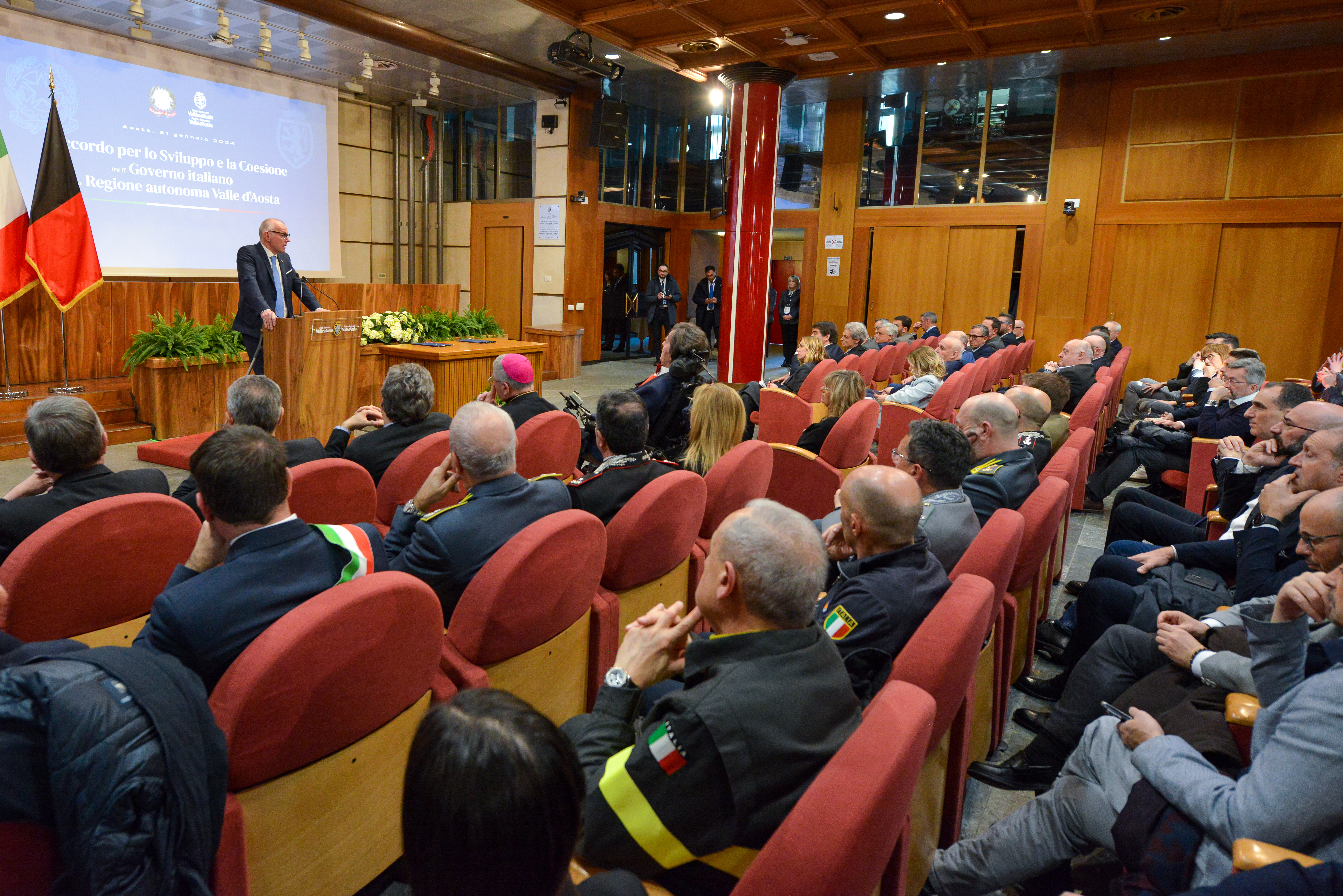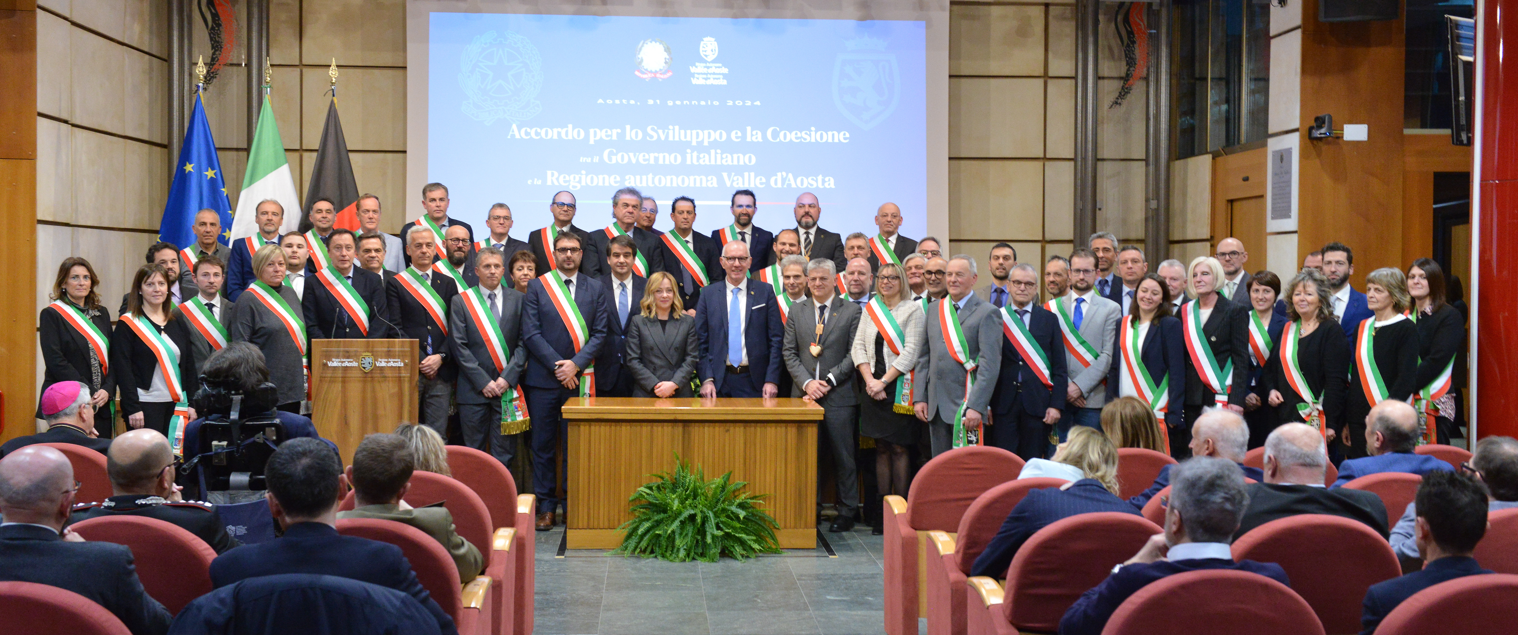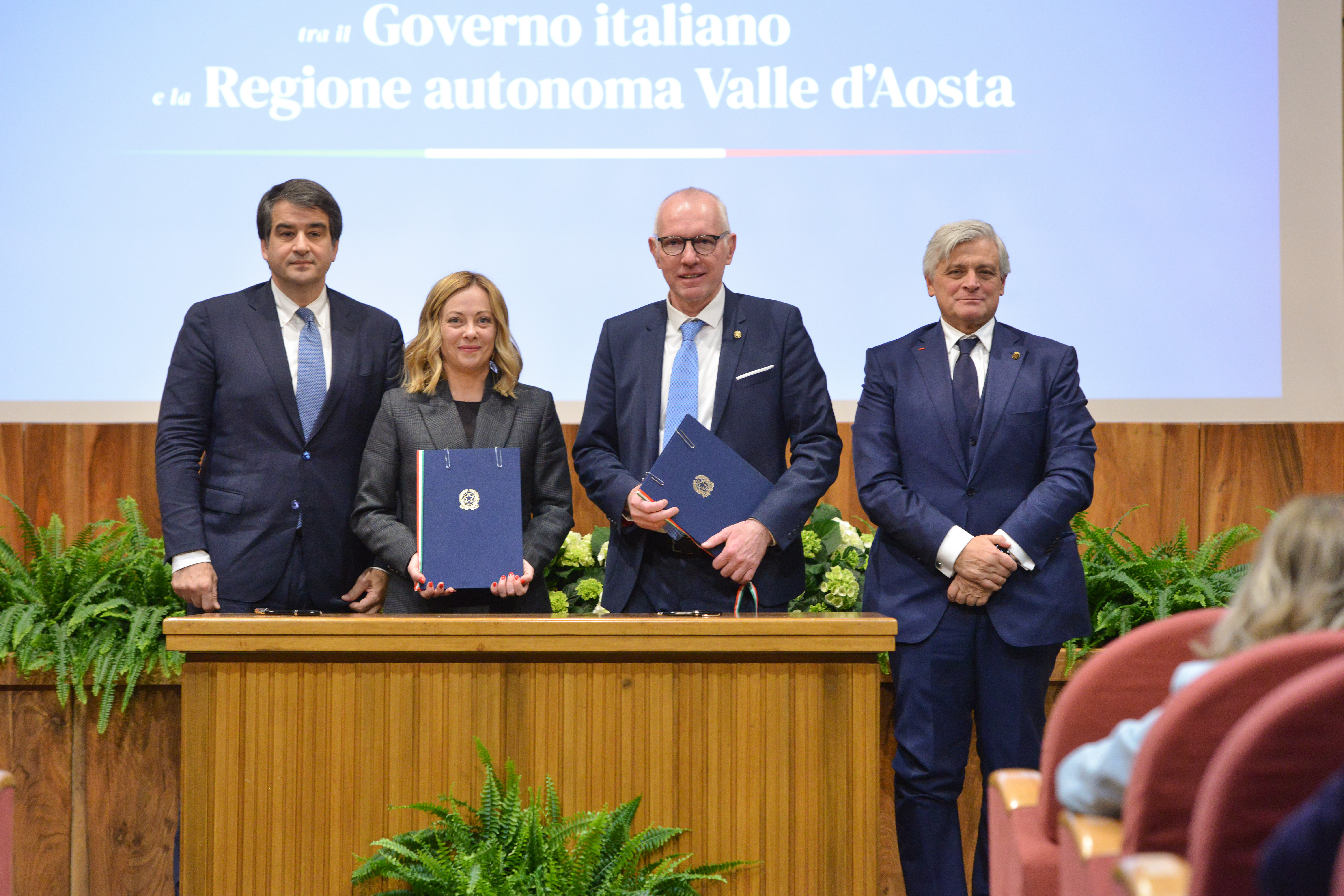 Mercoledì 31 gennaio 2024, nella Sala Maria Ida Viglino di Palazzo regionale, il Presidente del Consiglio dei Ministri Giorgia Meloni e il Presidente della Regione autonoma Valle d’Aosta, Renzo Testolin, alla presenza del Ministro per gli Affari europei, le Politiche di coesione e il Pnrr, Raffaele Fitto, e dell’Assessore agli affari europei, innovazione, PNRR e politiche nazionali per la montagna, Luciano Caveri, hanno firmato l’Accordo per il Fondo sviluppo e coesione 2021-2027 che ha assegna alla Valle d’Aosta 36 milioni 995.111,30 euro destinati alla realizzazione di tre progetti rivolti in modo particolare al mondo della scuola e alla sostenibilità.