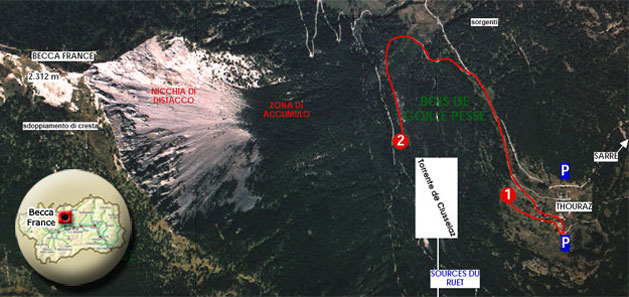 Raggiunta la frazione di Thouraz, è consigliabile attraversare il piccolo abitato, che ospita attualmente un grazioso ranch, e proseguire per un centinaio di metri in direzione W, dove è possibile osservare la frana nella sua interezza