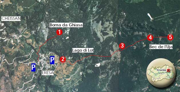 Il percorso qui proposto è costituito da due itinerari indipendenti tra loro: il primo conduce alla “Borna da Ghiasa”, il secondo consente di vedere il Lago di Lot, le falde detritiche ed il Flambeau d'Arlea.