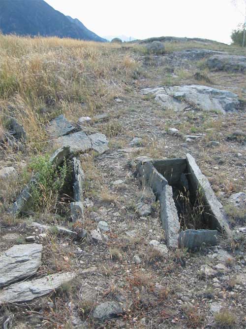 Gli scavi archeologici hanno portato alla luce 66 tombe a cista, ossia a forma di cassetta di pietra sporgente dal terreno, composte da quattro lastroni montanti e di una lastra di copertura debordante i lati della tomba. La pavimentazione della tomba era costituita dal suolo stesso.