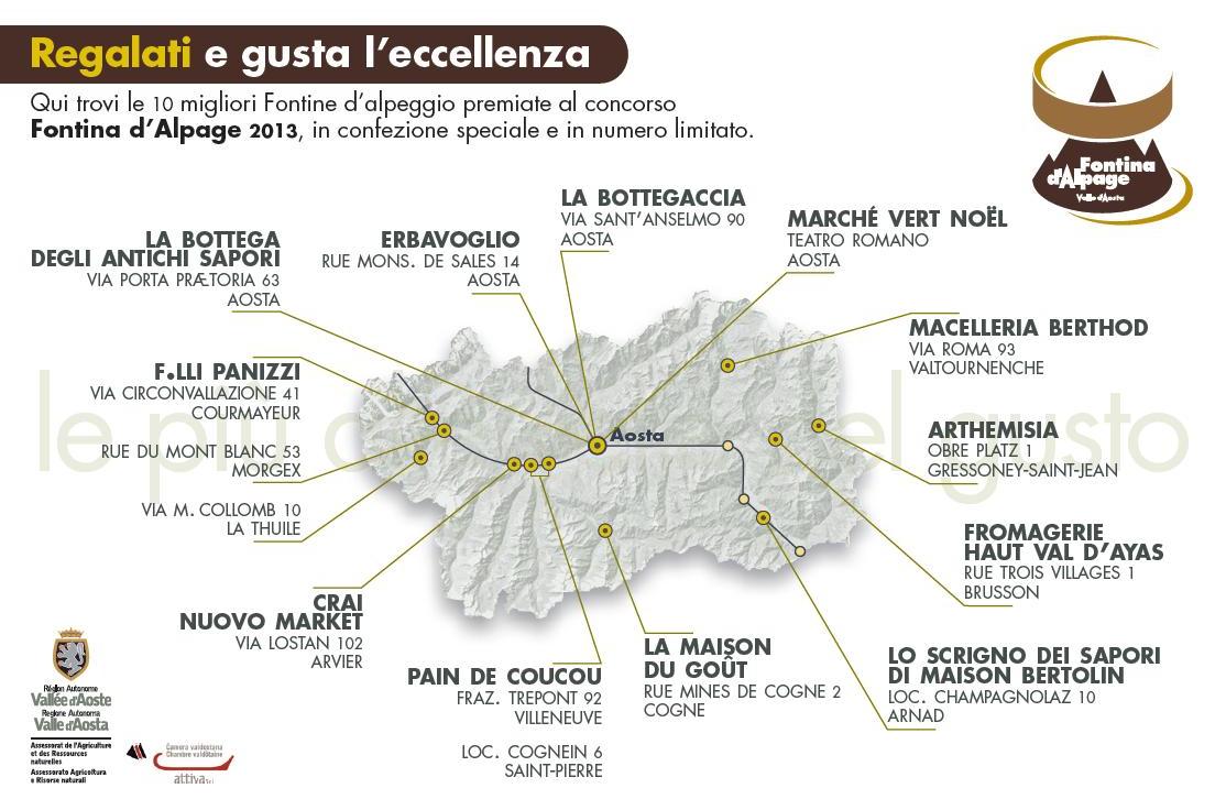 Toutes les dix Fontines Dop finalistes du Concours sont en vente au Marché Vert Noël d'Aoste et dans les magasins indiqués dans l'images ci-dessous (cliquez sur l'image)
