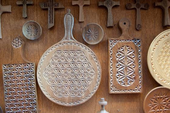 ed alimenti o per riporre il corredo della casa, con forma esterna di cassone, all'interno dotati di vari scomparti a seconda dell'uso, in alcuni casi anche con nascondigli ingegnosamente mimetizzati, decorati da disegni geometrici o da soggetti religiosi. Le culle, di modeste dimensioni, preparate dai futuri padri che spesso le regalavano alle spose il giorno delle nozze, sollevate da terra da corti piedi, collegati tra loro da due assicelle ricurve per assicurarne il dondolio. L'attuale produzione di mobili comprende tavoli, sedie, credenze, piattaie, letti ed armadi, solo per citarne alcuni, nell'ottica di abbellimento delle stanze componenti l'abitazione quali cucina, soggiorno, camera da letto, taverna...