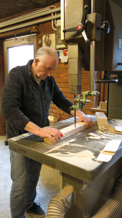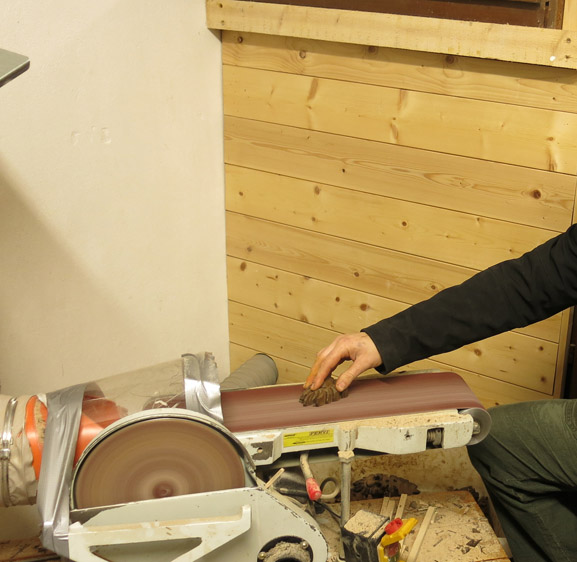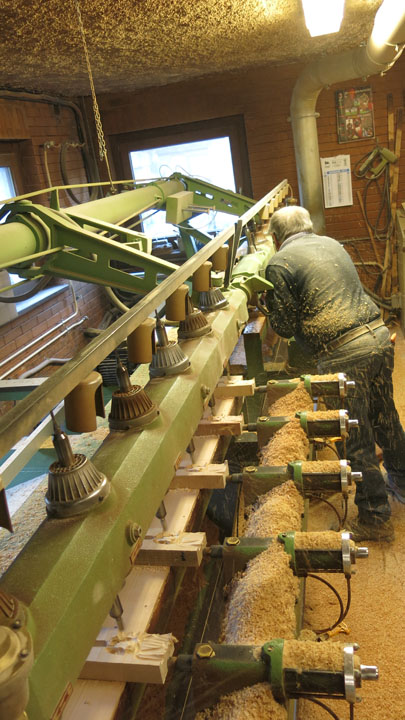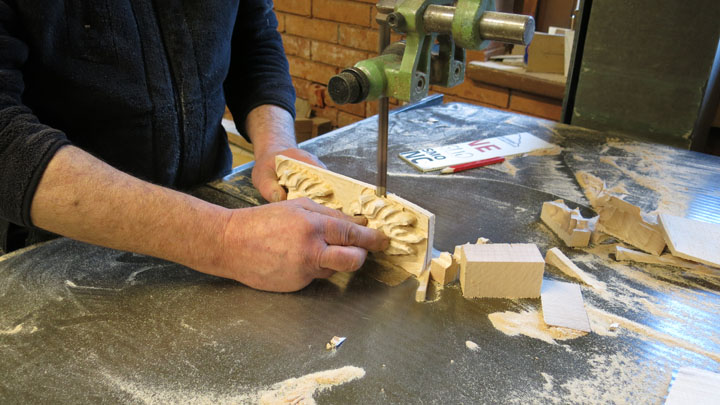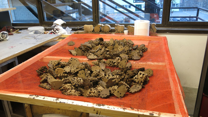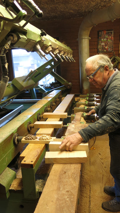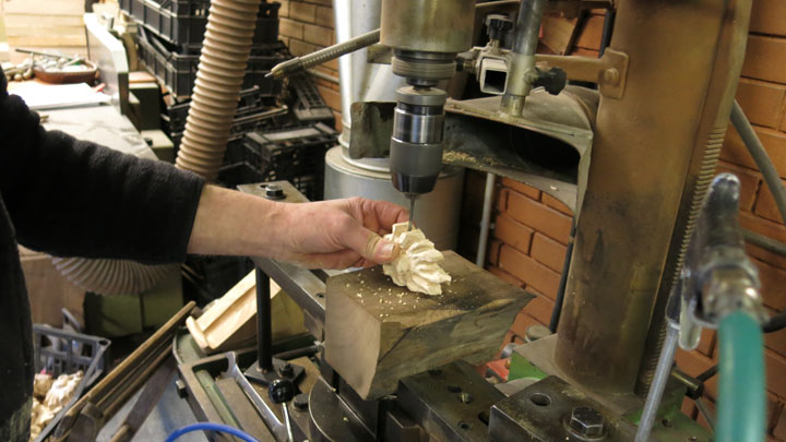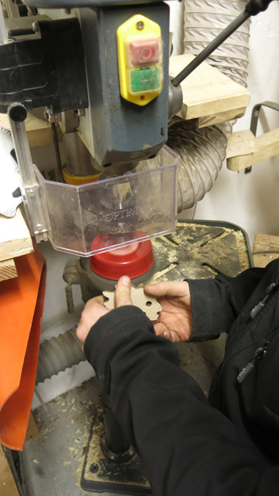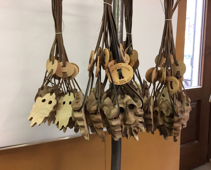 Siamo andati a visitare il laboratorio per scoprire le varie fasi della lavorazione del ciondolo: i pezzi in legno d’acero vengono tagliati e posizionati sul pantografo dove vengono sbozzati, ricevono cioè la prima sagomatura. Successivamente vengono effettuate due fessure ai lati per inserire il laccio in cuoio. Si passa poi alla verniciatura, alla levigatura della parte posteriore della maschera, alla spazzolatura e infine si inserisce il laccio.