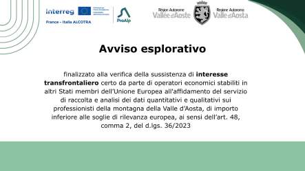 finalizzato alla verifica della sussistenza di interesse transfrontaliero certo da parte di operatori economici stabiliti in altri Stati membri dell’Unione Europea all'affidamento del servizio di raccolta e analisi dei dati quantitativi e qualitativi sui professionisti della montagna della Valle d’Aosta, di importo inferiore alle soglie di rilevanza europea, ai sensi dell’art. 48, comma 2, del d.lgs. 36/2023.