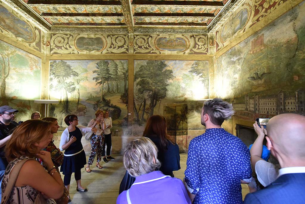 Una facciata bianca e sobria che racchiude al suo interno un susseguirsi di stanze decorate da magnifici affreschi tra cui spicca, quale gioiello nascosto, la cosiddetta “galleria delle Donne forti”, così chiamata per i particolari soggetti qui raffigurati: figure di donne tratte dall’Antico Testamento, dalla storia antica, classica e medievale rappresentate accanto a eroine emblematiche per le loro qualità e virtù morali in un sapiente gioco di rimandi e riferimenti sospesi tra filosofia, teologia e quotidianità.