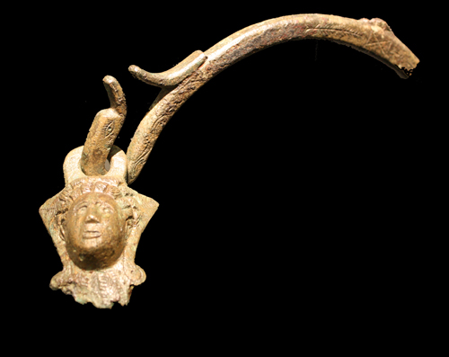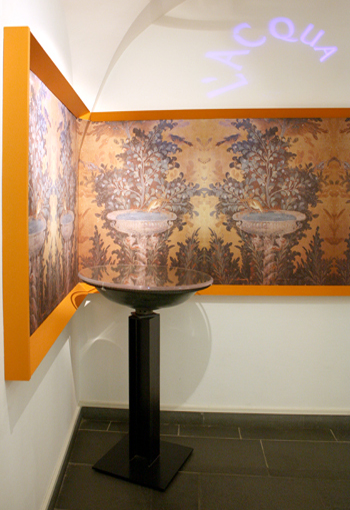 La reproduction d’une fresque de Pompéi décore le fond d’un bassin en bronze, dont on ne connaît malheureusement pas la provenance, mais qui faisait probablement partie d’une fontaine dans le jardin d’une habitation privée.