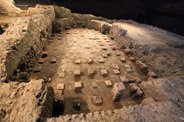 A un vestiaire (apodyterium), impossible à localiser avec certitude, fait suite un tepidarium, local à la température modérée d'où l'on passe dans le calidarium, avec deux vasques d'eau chaude sur les côtés courts, une rectangulaire, l'autre semi-circulaire; la haute température est garantie ici par un système de diffusion de l'air au moyen d'un hypocaustum situé sous le sol et de conduites en brique (tubuli), appuyées contre les murs.