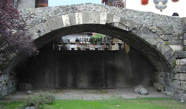 À environ 150 m à l'Est de l'arc honoraire d'Auguste, dans l'ancien faubourg du Pont de Pierre, il est possible d'admirer un exemple notoire de pont romain. Sa structure est constituée d'une seule arche surbaissée, composée de claveaux radiaux qui s'appuient directement sur des embasements très larges, renforcés par des piles et construits avec des gros blocs de poudingue (conglomérat fluvial extrait des carrières littorales de la Doire); le diamètre est d'environ 17 m, tandis que la largeur, parapets compris, est de 5,95 m.