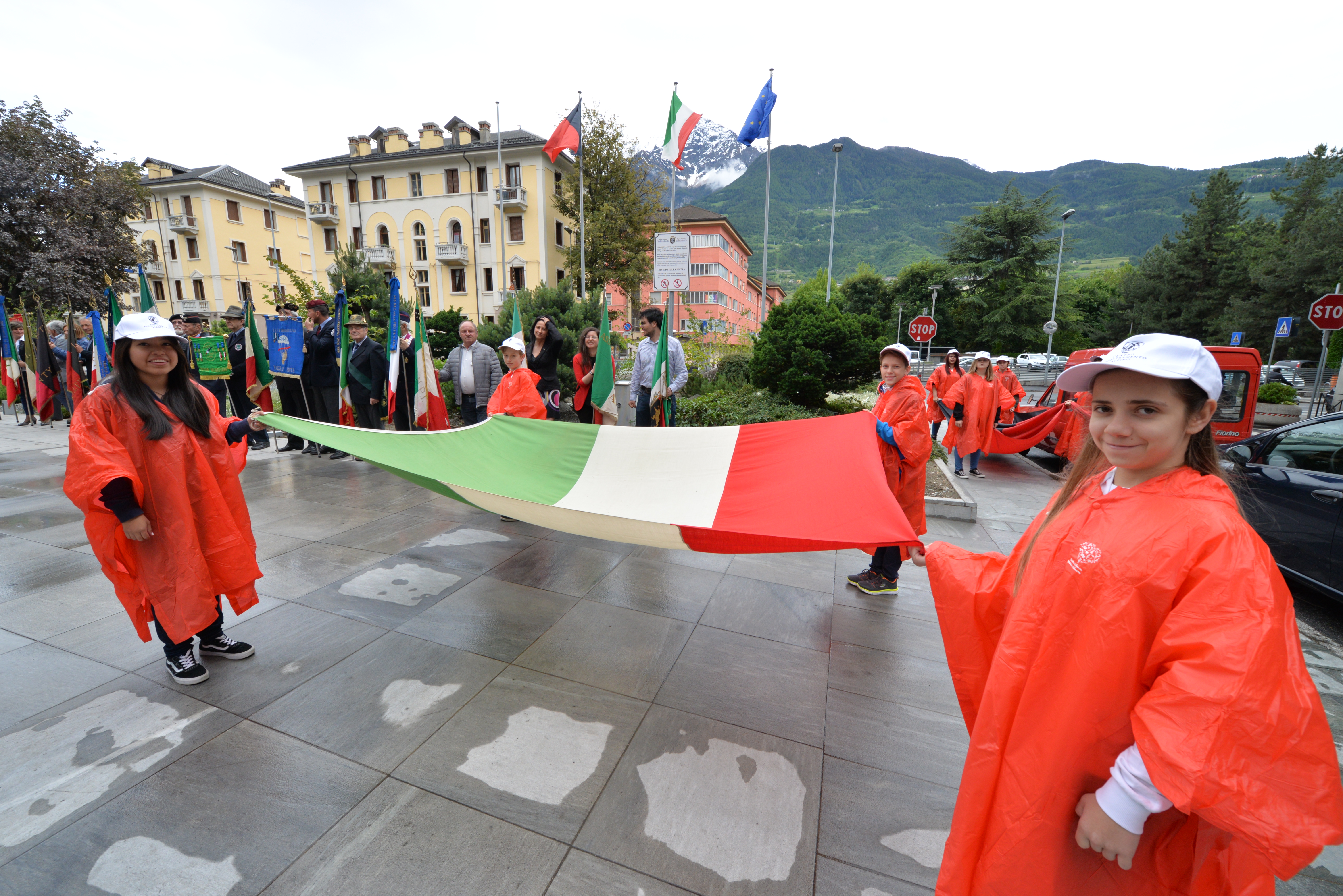 Onori alla bandiera da parte degli alunni dell'Istituzione scolastica Saint-Roch di Aosta e canti del coro scolastico