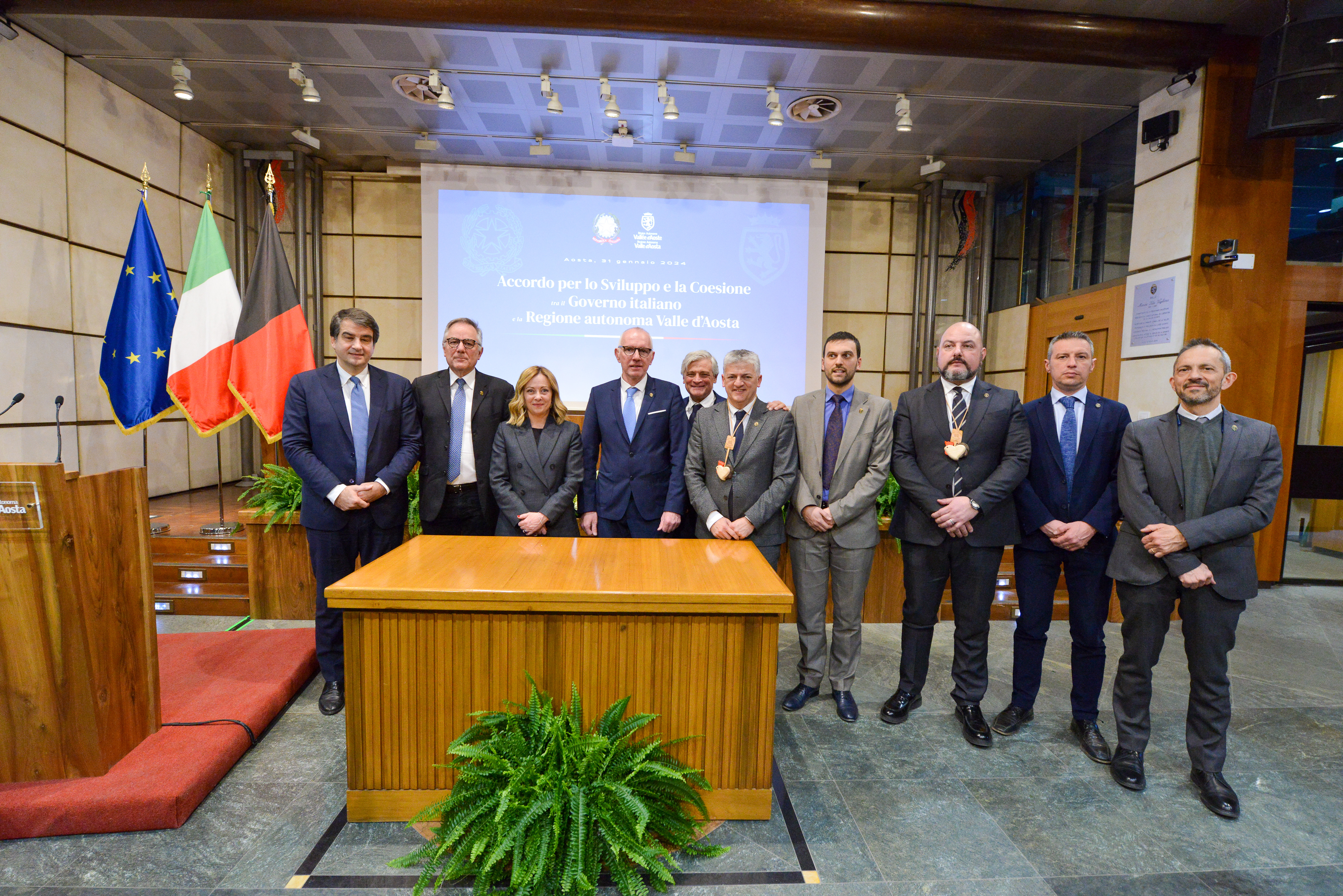 Mercoledì 31 gennaio 2024, nella Sala Maria Ida Viglino di Palazzo regionale, il Presidente del Consiglio dei Ministri Giorgia Meloni e il Presidente della Regione autonoma Valle d’Aosta, Renzo Testolin, alla presenza del Ministro per gli Affari europei, le Politiche di coesione e il Pnrr, Raffaele Fitto, e dell’Assessore agli affari europei, innovazione, PNRR e politiche nazionali per la montagna, Luciano Caveri, hanno firmato l’Accordo per il Fondo sviluppo e coesione 2021-2027 che ha assegna alla Valle d’Aosta 36 milioni 995.111,30 euro destinati alla realizzazione di tre progetti rivolti in modo particolare al mondo della scuola e alla sostenibilità.
