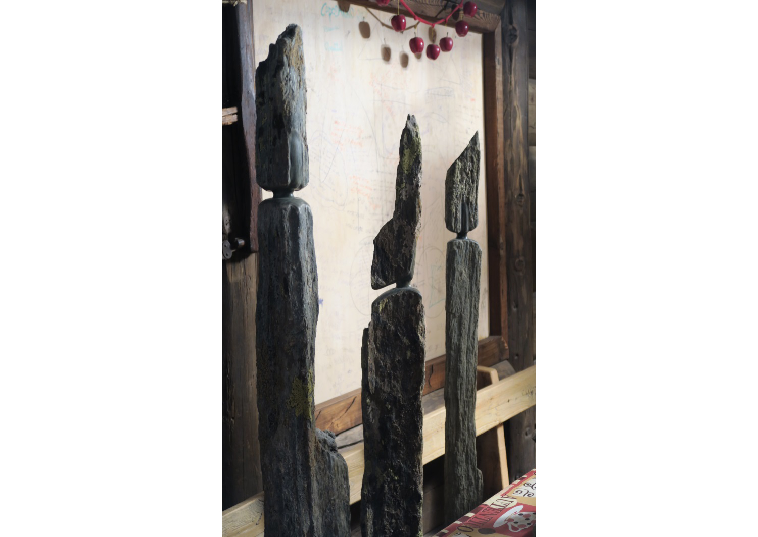 Il percorso espositivo, curato dalla Struttura Attività espositive in collaborazione con la Struttura Patrimonio Archeologico, riprende infatti idealmente gli allineamenti preistorici sia delle stele, sia dei pali totemici ripensati da Savin attraverso stele lignee con applicate alla sommità corna di cervo lavorate. Ci sono poi stele di dimensioni più contenute, impreziosite da colorati licheni.