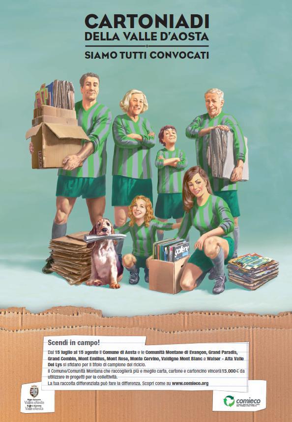 Si è concluso il campionato della raccolta differenziata di carta e cartone "Cartoniadi della Valle d'Aosta", svoltosi dal 15 luglio al 15 agosto a cui hanno partecipato il Comune di Aosta e le Comunità Montane Evançon, Grand Paradis, Grand Combin, Mont Emilius, Mont Rose, Monte Cervino, Valdigne Mont Blanc e Walser - Alta Valle del Lys per aggiudicarsi il titolo di campione del riciclo.