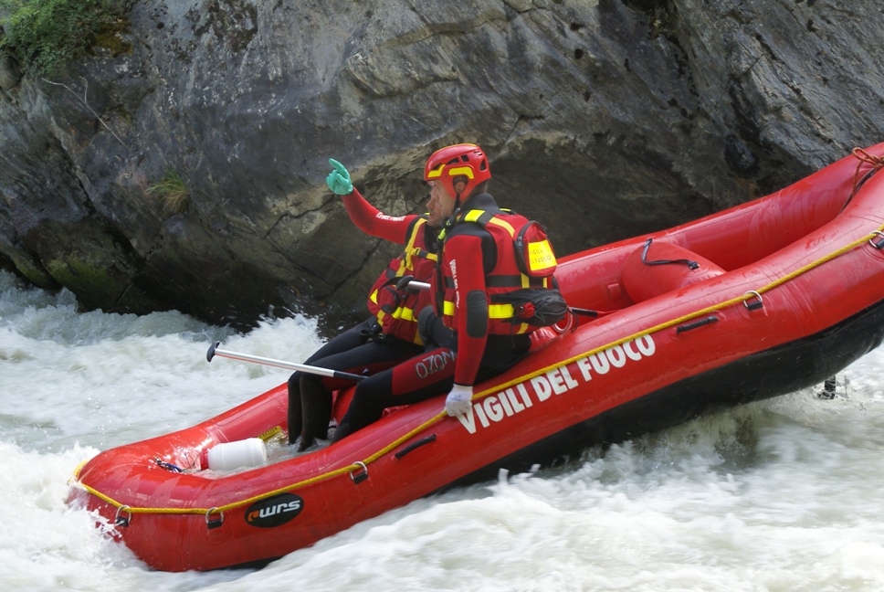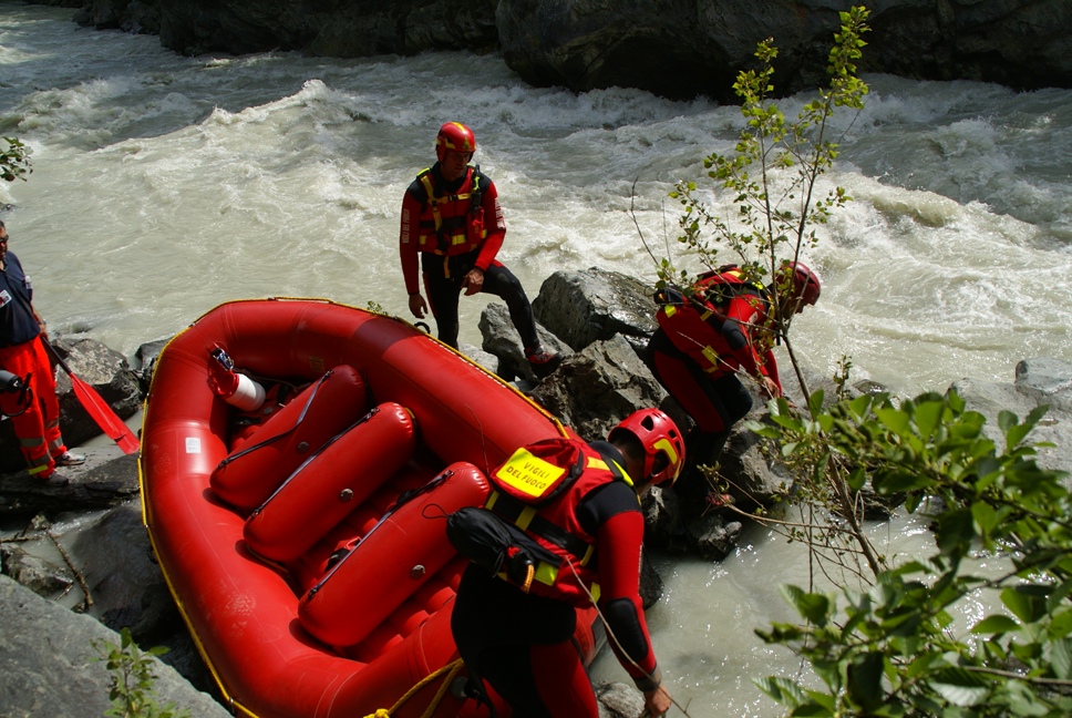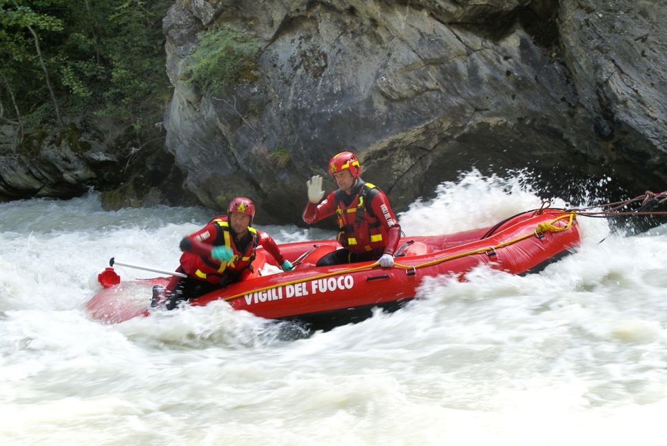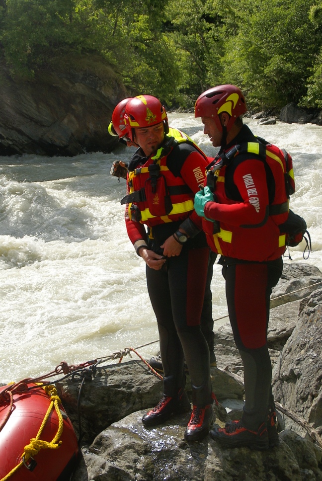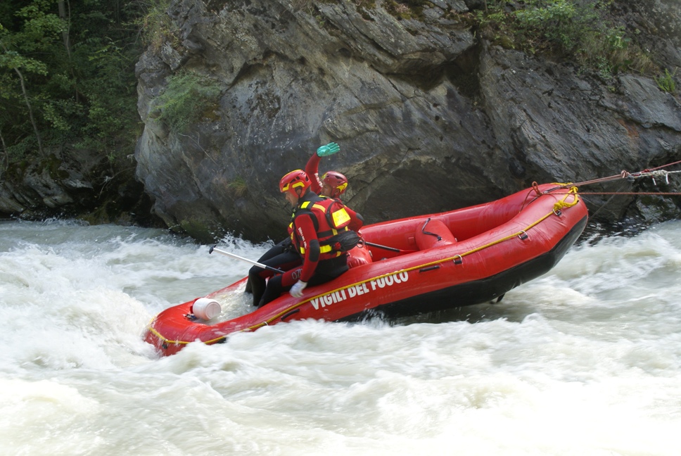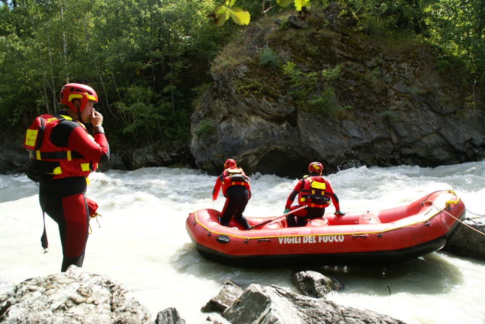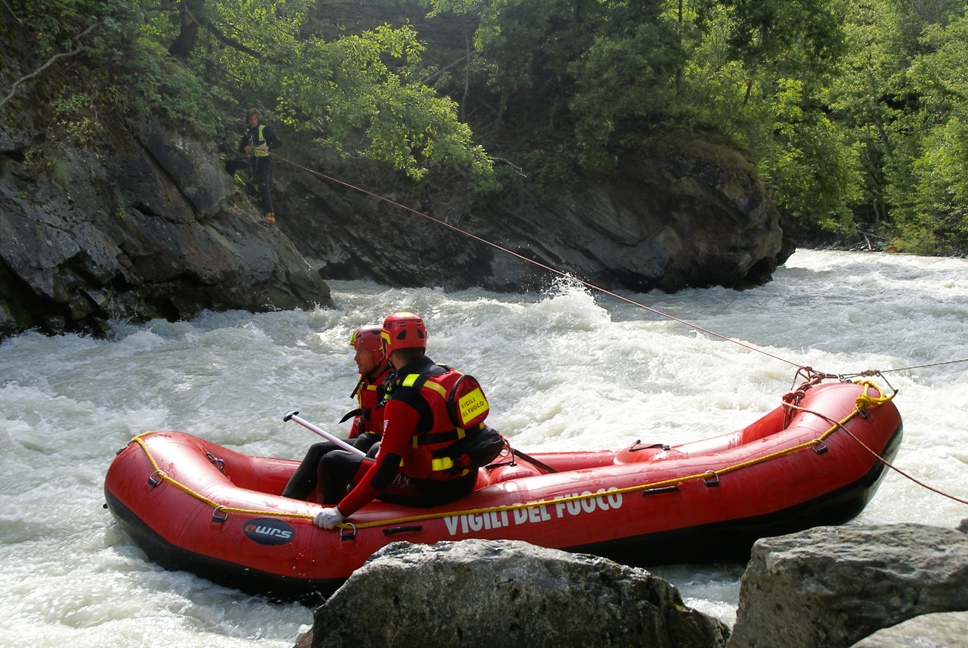 Di seguito le immagini relative ad un intervento per soccorso persona sul fiume Dora nel periodo estivo, quando la portata del corso d'acqua č importante. A causa della corrente, nella fattispecie, č stato necessario costruire una tirolese (una carrucola), per permettere al gommone da rafting dei vigili del fuoco di essere posizionato da altri operatori in mezzo al corso d'acqua in modo stabile e consentire ai soccorrritori di operare. La particolare conformazione accidentata dell'alveo del fiume crea parecchi rulli e vortici che rendono precario l'equilibrio dei soccoritori e le operazioni ancora pių difficili.