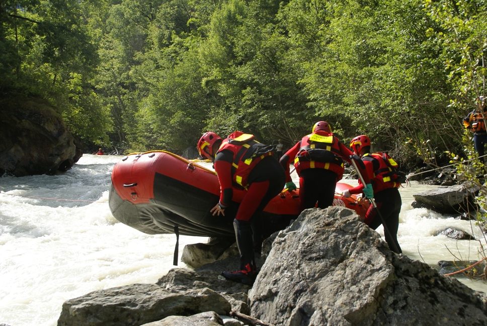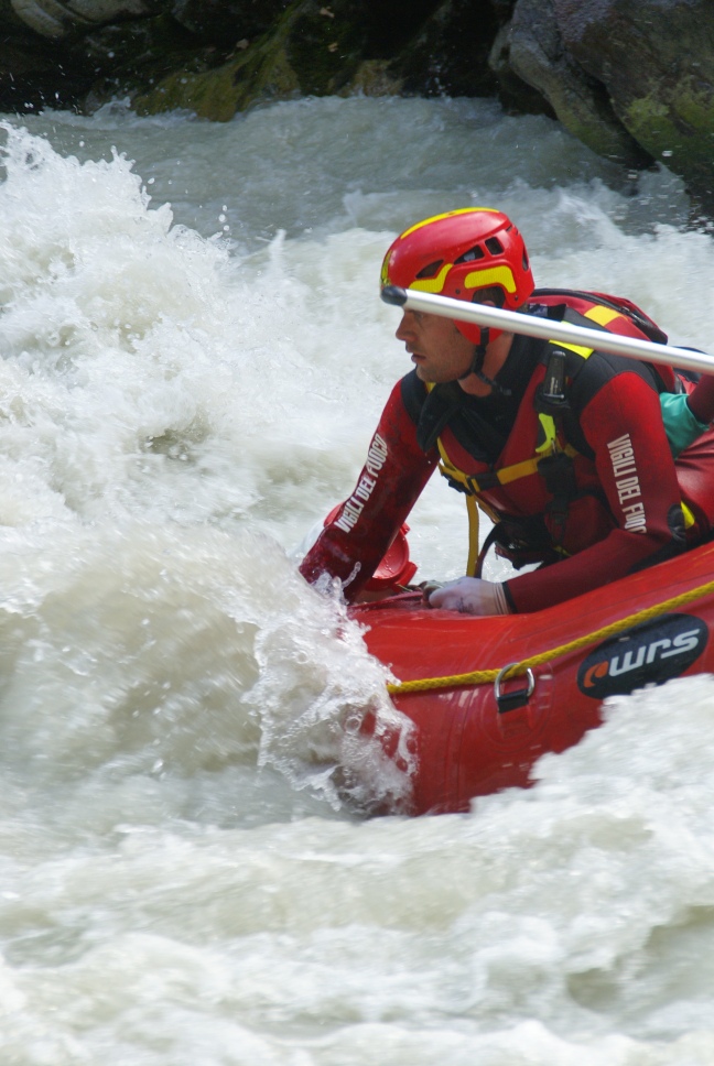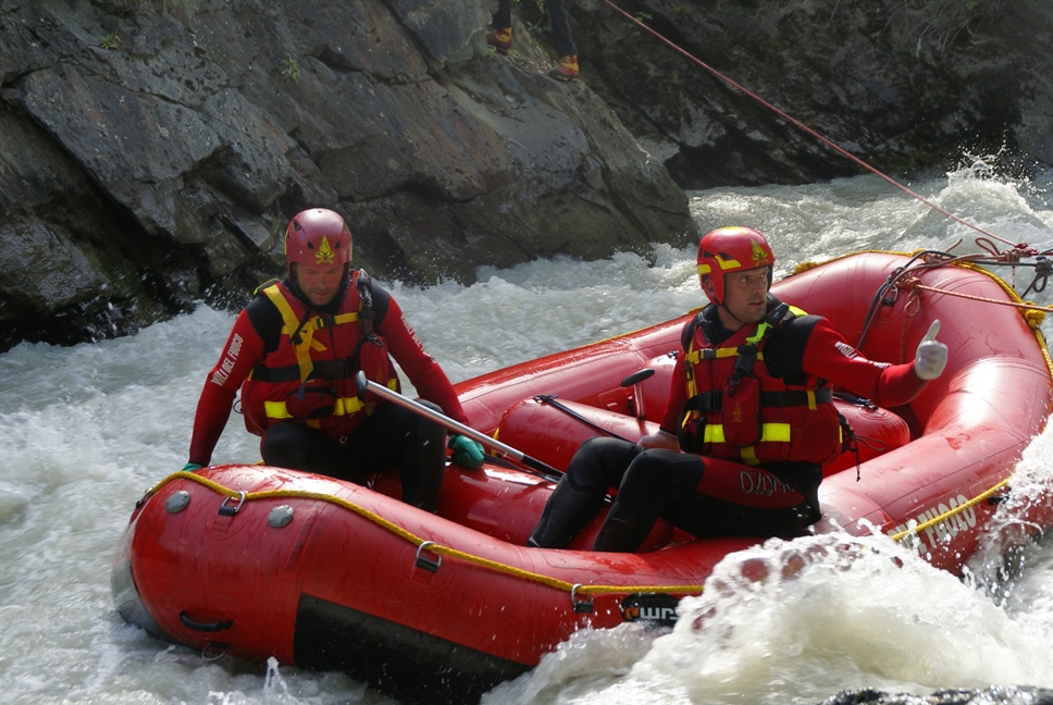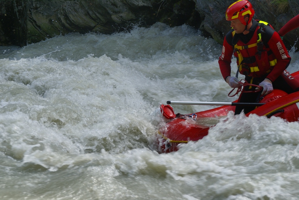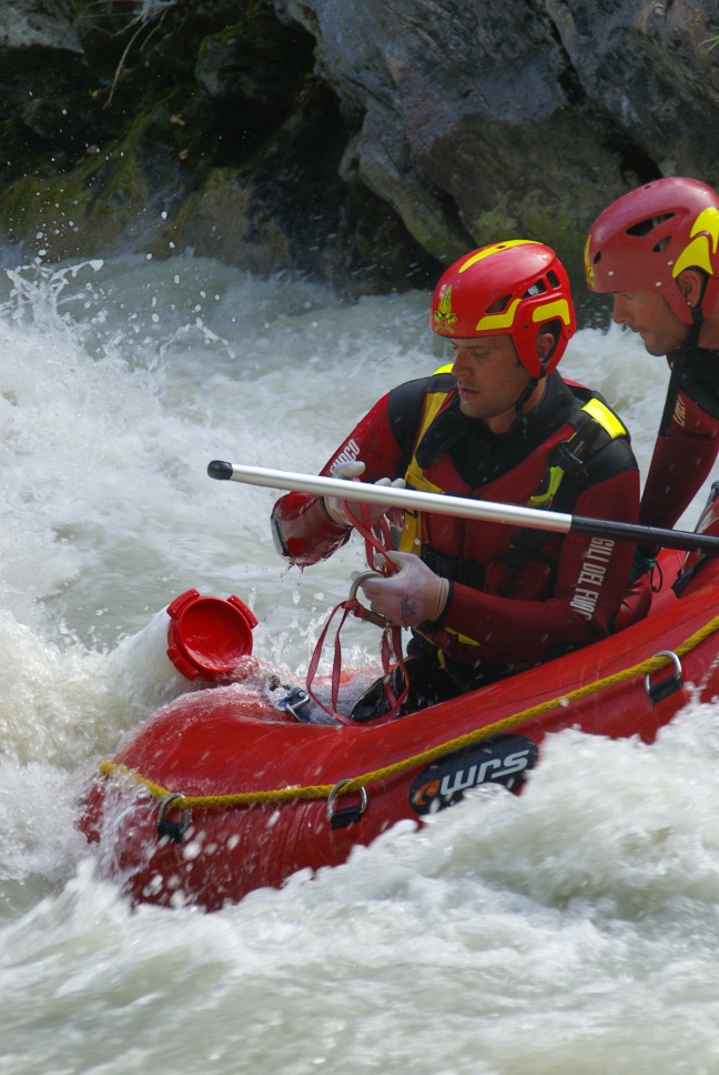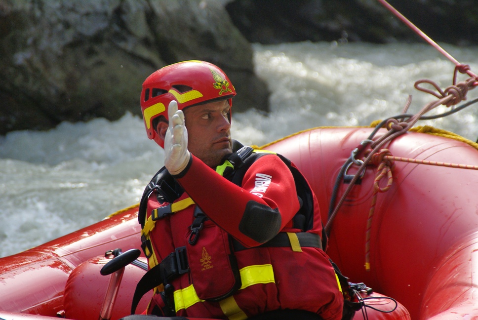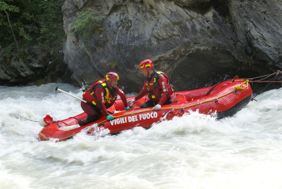 Di seguito le immagini relative ad un intervento per soccorso persona sul fiume Dora nel periodo estivo, quando la portata del corso d'acqua č importante. A causa della corrente, nella fattispecie, č stato necessario costruire una tirolese (una carrucola), per permettere al gommone da rafting dei vigili del fuoco di essere posizionato da altri operatori in mezzo al corso d'acqua in modo stabile e consentire ai soccorrritori di operare. La particolare conformazione accidentata dell'alveo del fiume crea parecchi rulli e vortici che rendono precario l'equilibrio dei soccoritori e le operazioni ancora pių difficili.